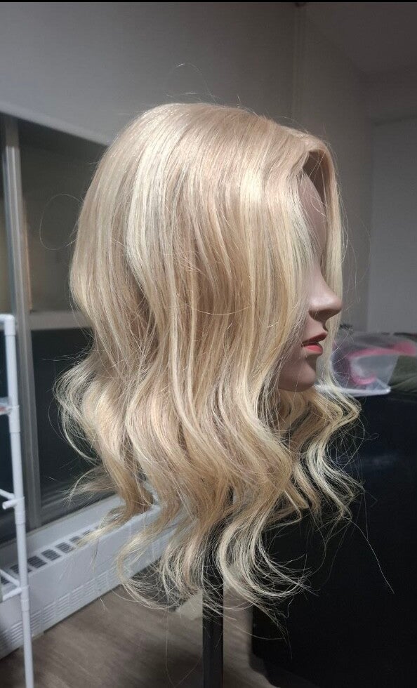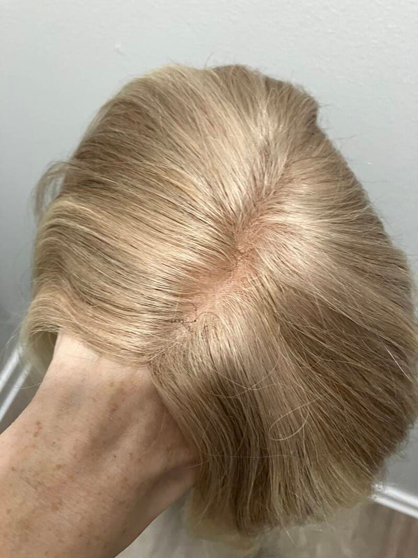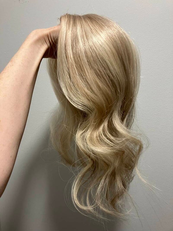 We're excited to introduce our newest collection we've been working tirelessly and are delighted to share this gorgeous new piece! Summer is a 7x7 inch full coverage base, fully hand-tied mono base topper made from our highest quality European hair. This stunning dimension blonde is part of our new summer collection, featuring five new stunning pieces, all available for immediate shipping. This 16-inch unit offers length and coverage; for reference, my natural hair under this piece is a short, dark brown pixie cut. These pieces provide complete coverage on their own or can be paired with our volume weft for a complete, voluminous transformation. Not quite ready for a wig? Our new full coverage toppers and volume wefts have got you covered. This unique combination provides beautiful length and volume in just a few clicks. Contact us now to have your matching topper and volume weft made today. Choose from 31 beautiful colors or let us custom color one to match your inspiration photo and create your dream hair.