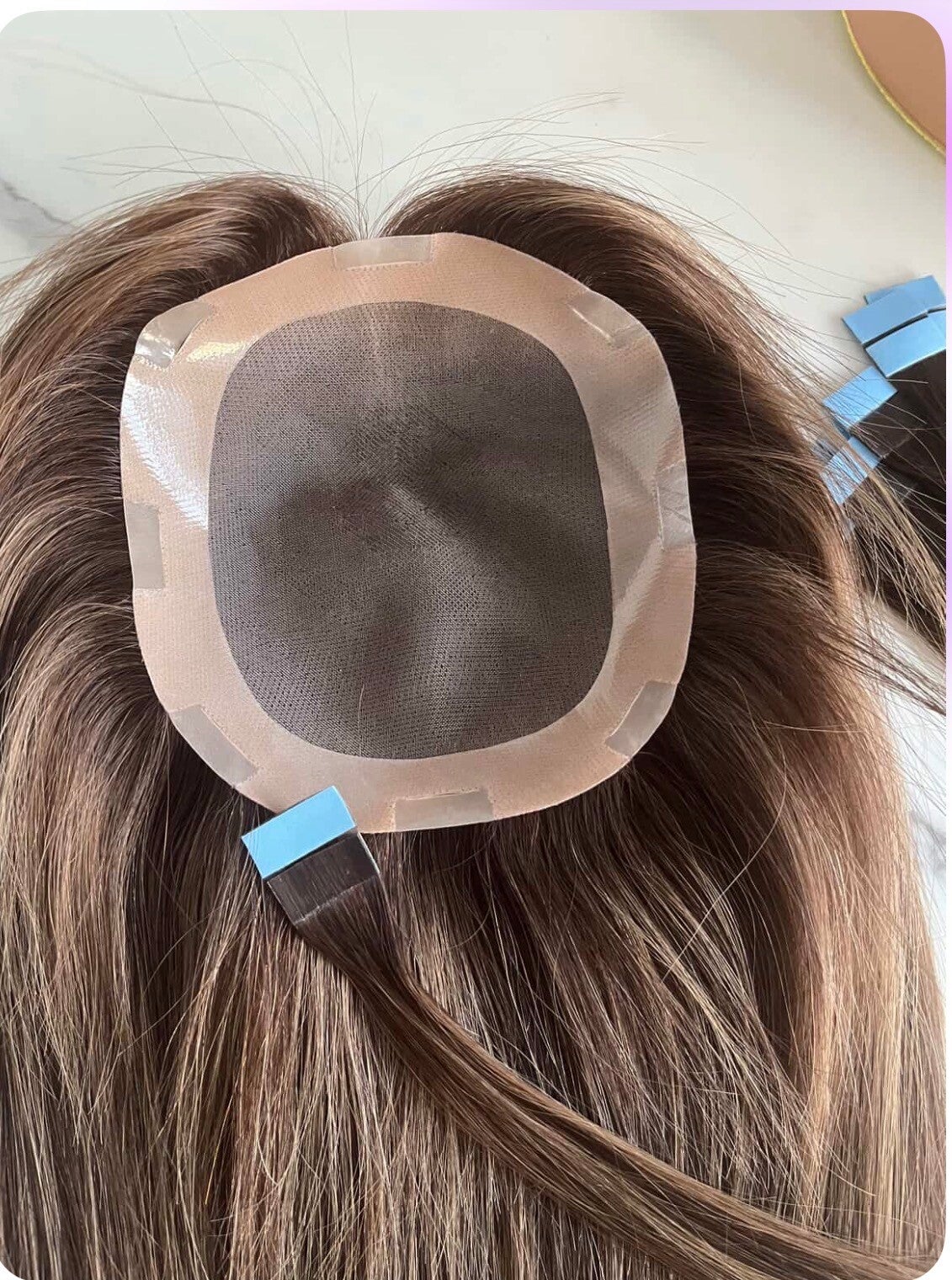 Our tape-in topper is a semi-permanent hairpiece designed to cover thinning hair or bald spots on the crown of the head. Unlike standard "clip-in" toppers that you take off every night, tape-in toppers are secured to your natural hair using medical-grade adhesive strips.